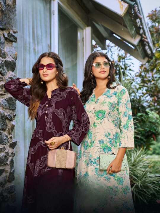 a-line kurta set for womenPrinted Vetican silk kurti with pants