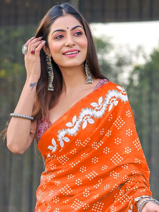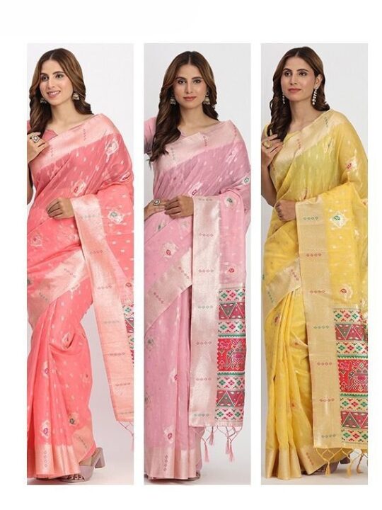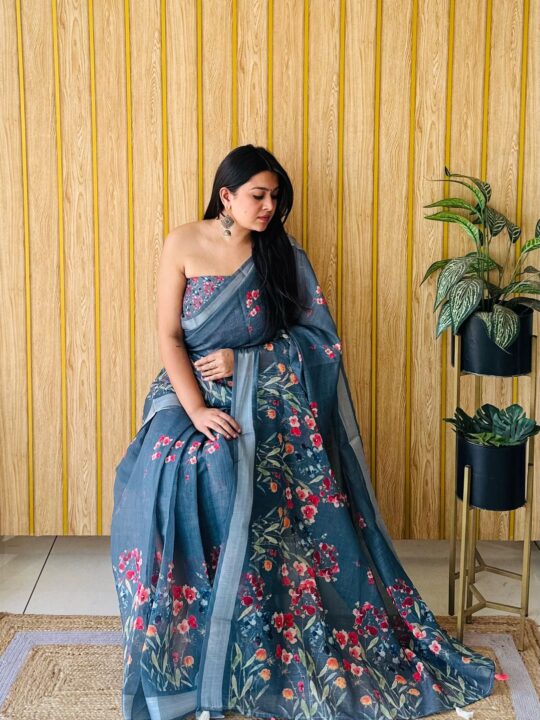 linen saree with gold jari borderMangalya Linen Saree with Gold Jari Border and Digital Print Blouse from Pramukhmart Collection