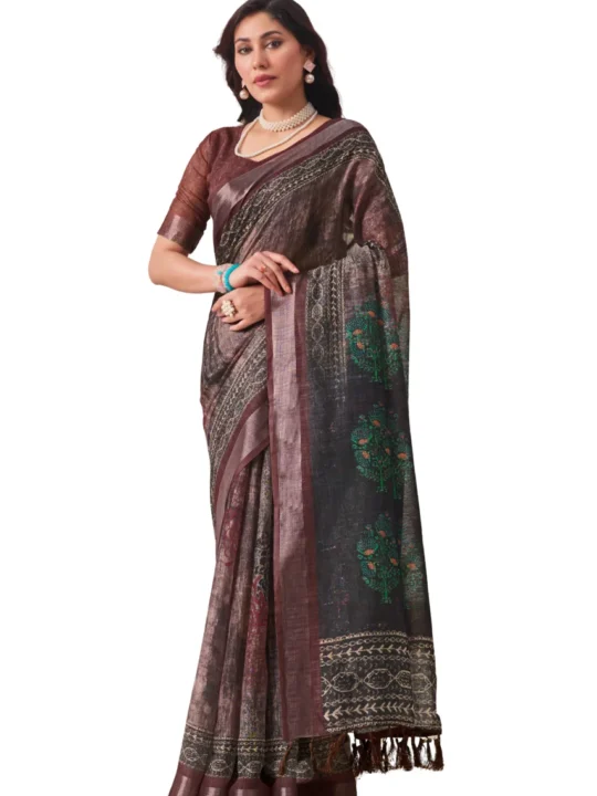 Linen Cotton Saree with Stylish Tassels and Fine Weave. This saree combines earthy elegance with intricate digital artistry, making it perfect for festive celebrations and elegant gatherings.