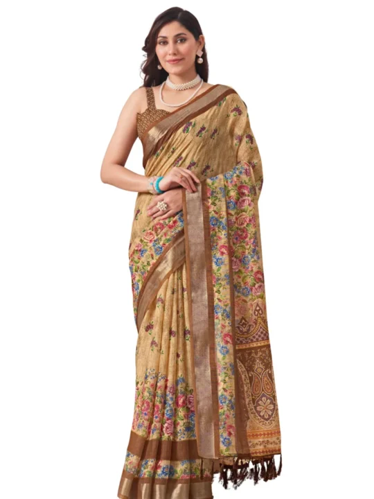 Linen Cotton Saree with stylish tassels, featuring a rich digital print and zari border. Perfect for festive and elegant occasions!
