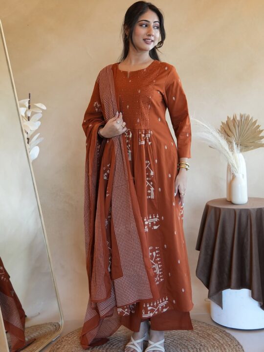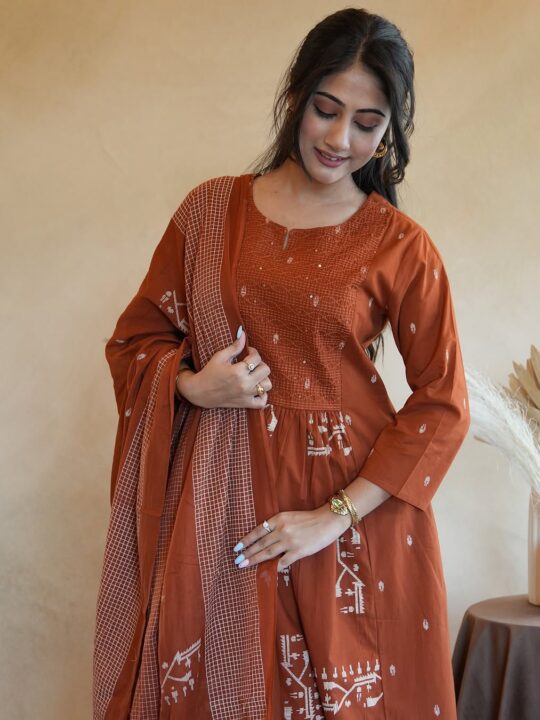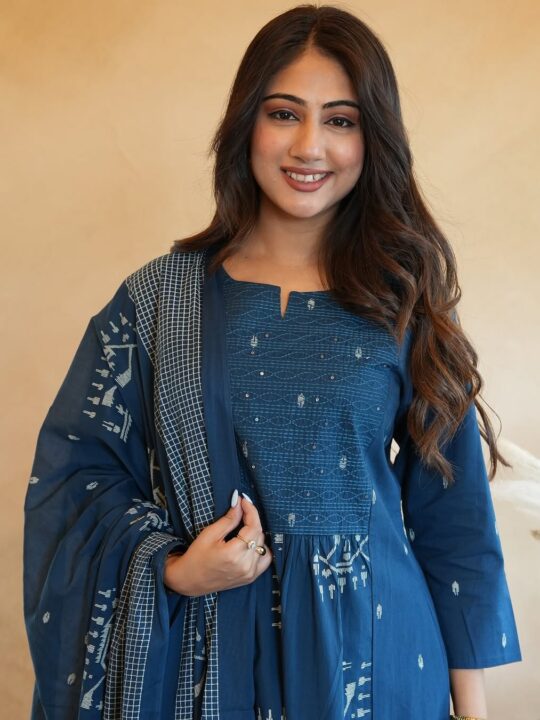 Stay effortlessly stylish with Pramukhmart’s Anarkali cotton kurta set. Designed for comfort and elegance, this set features beautiful pitten work, soft prints, and a lightweight malmal dupatta. Whether you’re dressing up for a casual outing or a festive gathering, this ensemble is a wardrobe essential.