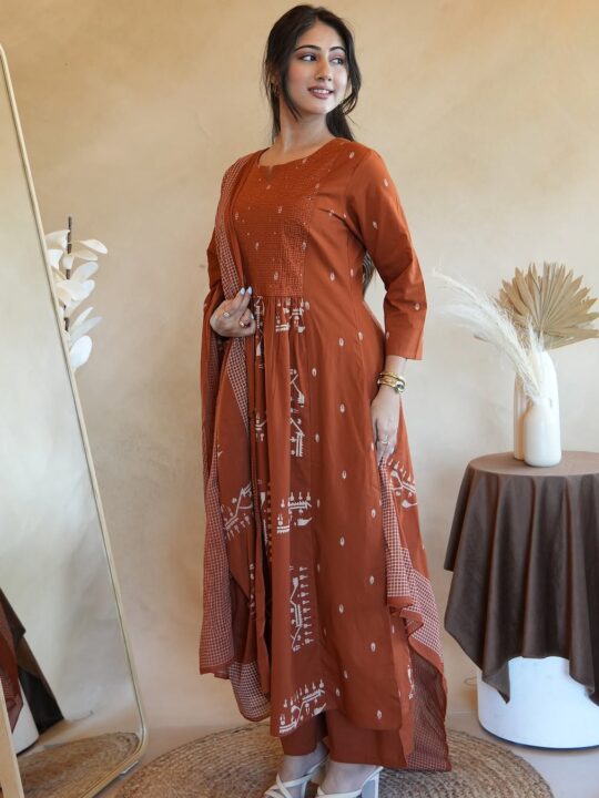 Shop elegant Anarkali cotton kurta set with printed pants & soft malmal dupatta. Available in sizes M to 3XL. Perfect for daily wear & festive days.