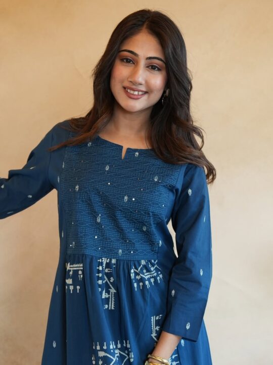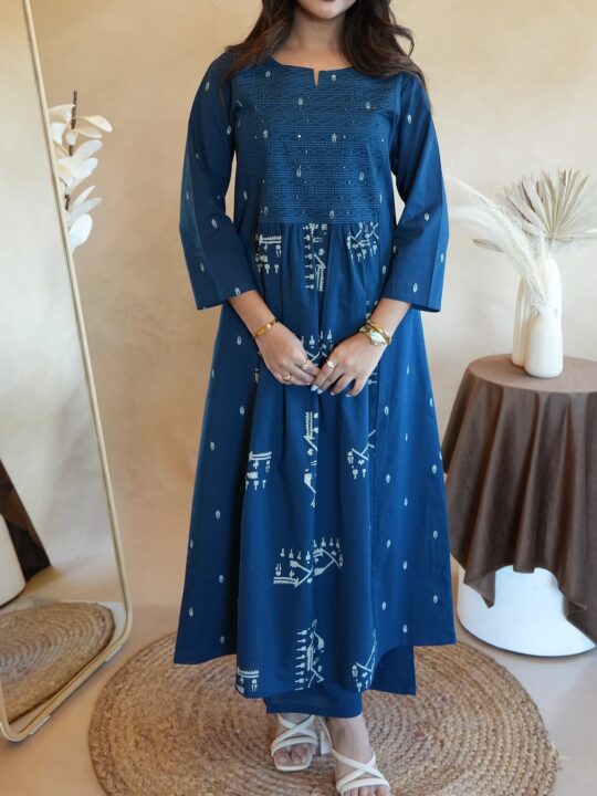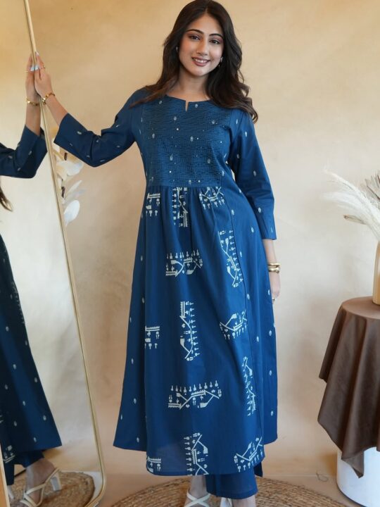 This kurta set pairs beautifully with jhumkas and kolhapuri sandals. You can also add a tote bag for a fusion look. Because of its breathable fabric, it’s ideal for hot summer days. Moreover, it works great for daily wear, festive brunches, or even office casuals. The vibrant print adds a touch of tradition with a trendy twist.