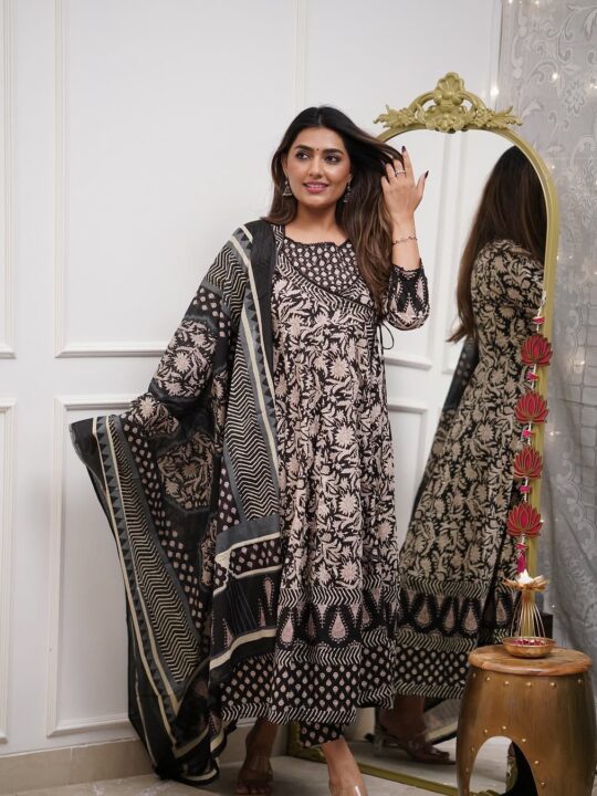 Anarkali stitched suit set – crafted in premium heavy cotton with hand khatli embroidery and zari weaving, offering elegance, comfort, and festive charm for weddings and special occasions.