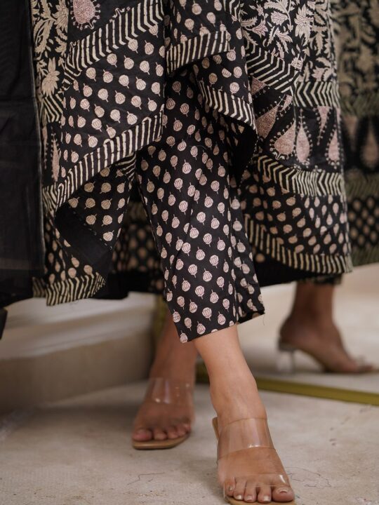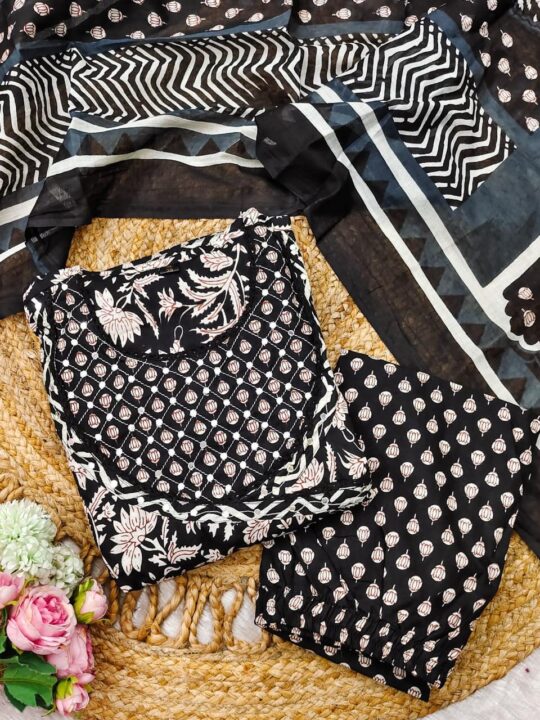 This suit is perfect for Diwali parties, pujas, and family functions. Pair it with jhumkas and ethnic flats to complete your look. Its intricate embroidery also makes it ideal for small wedding events. In addition, its cotton base keeps you comfy for hours.