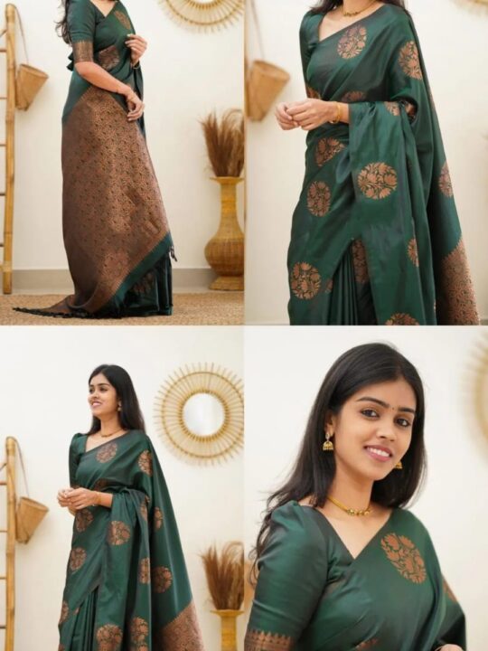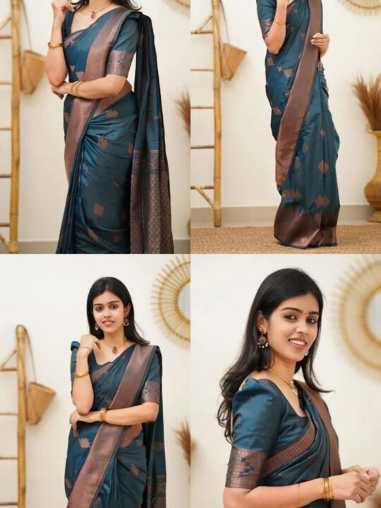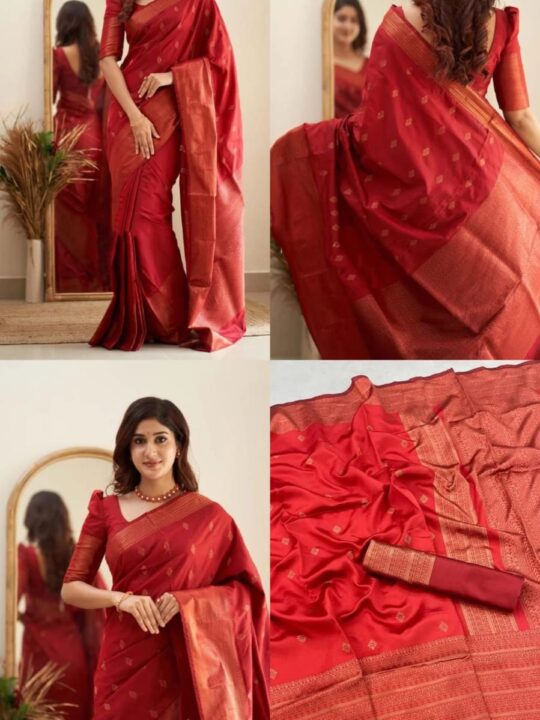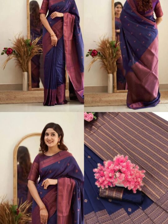 Wrap yourself in timeless elegance with this Banarasi Soft Silk Saree with Zari Work from Pramukhmart. Crafted with care, this saree blends soft silk with intricate golden and copper zari motifs. It’s lightweight, easy to drape, and perfect for festive celebrations.