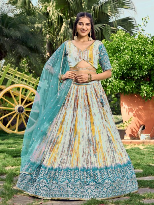 Chaniya choli for women from Pramukhmart elevates your festive look with elegance. Beautifully crafted in luxurious fabric with zari and sequin work, perfect for weddings, parties, and cultural celebrations throughout the season effortlessly.