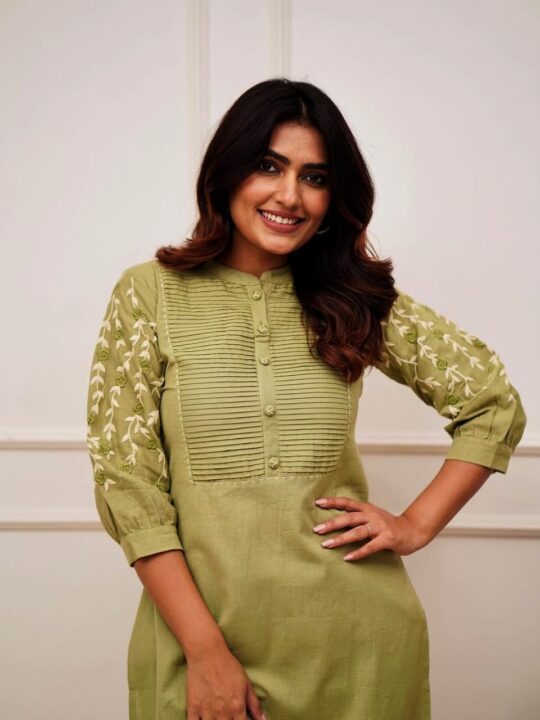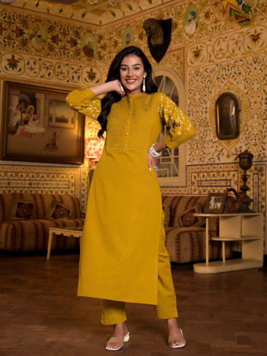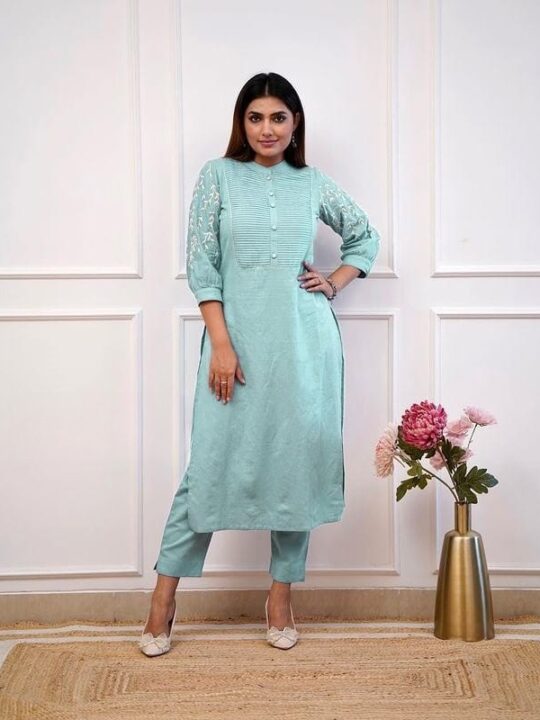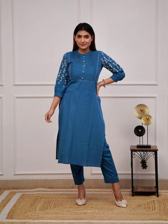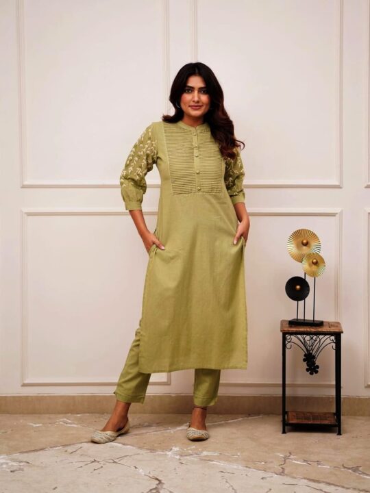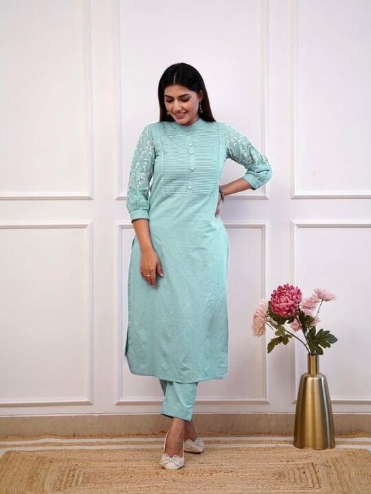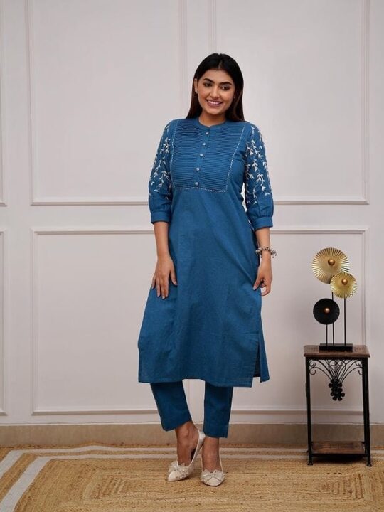 Pair this kurta set with minimal jewelry and block heels for a smart office look. For a weekend brunch, style it with juttis and a pastel tote. Because the cotton fabric is breathable, it’s a great pick for summer days. In addition, its vibrant colors keep your outfit lively without being too loud.