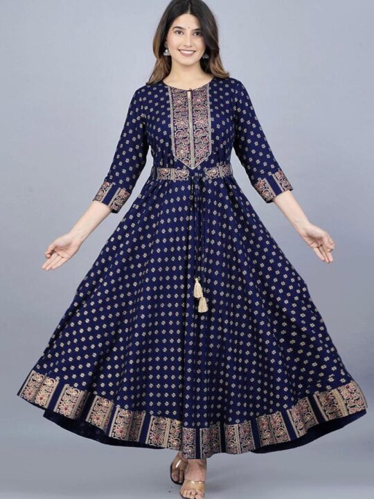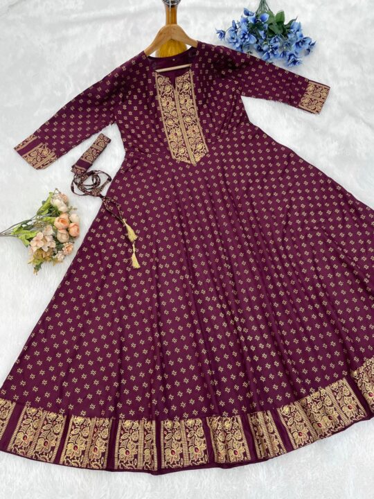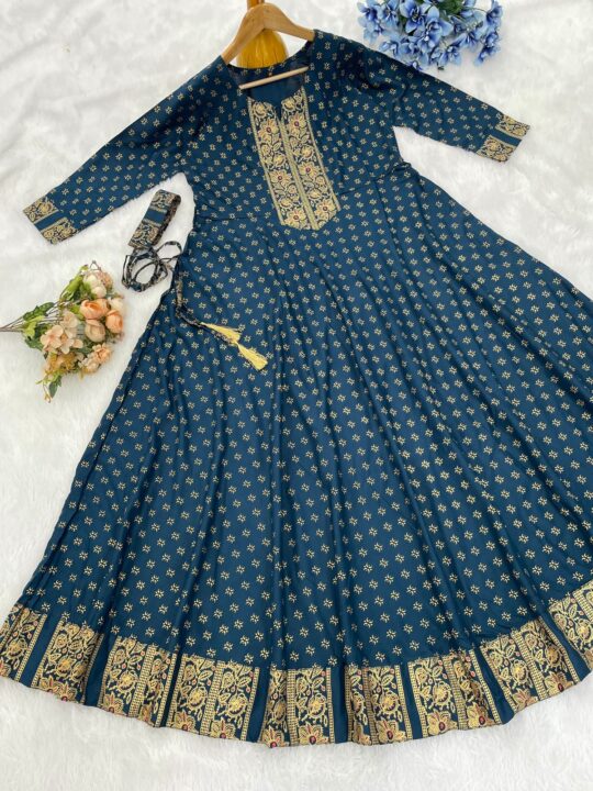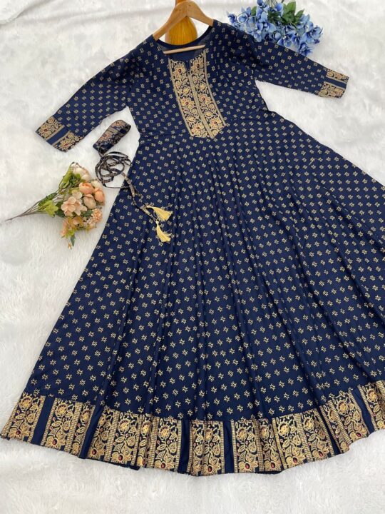 Rayon print gown crafted in 14kg rayon with foil detailing, perfect for parties and festive occasions, available in multiple sizes and colors.