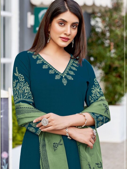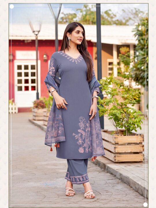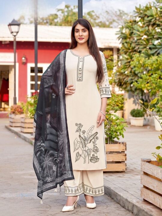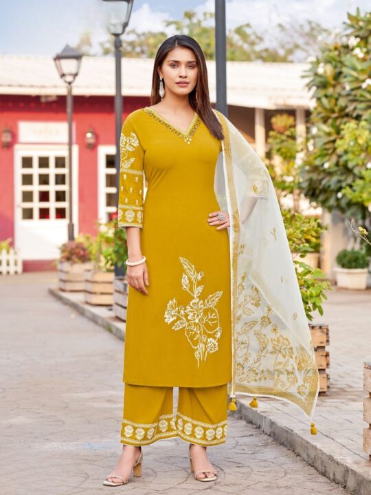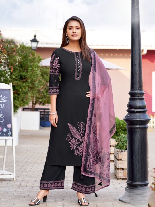 Embroidered rayon kurti set for women. Designed by Pramukhmart, this three-piece ethnic outfit blends charm and comfort. The floral detailing and soft fabric make it perfect for both daily wear and special moments.