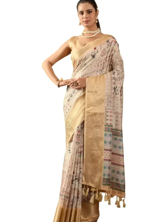 Floral Print Saree – Soft Lichi. Perfect for festive occasions, it combines comfort, style, and vibrant artistry.