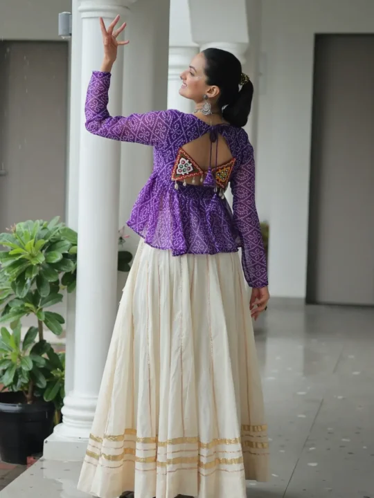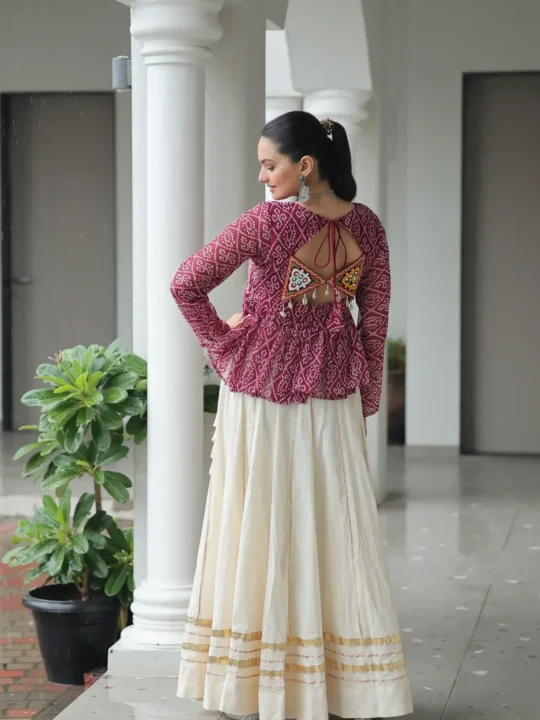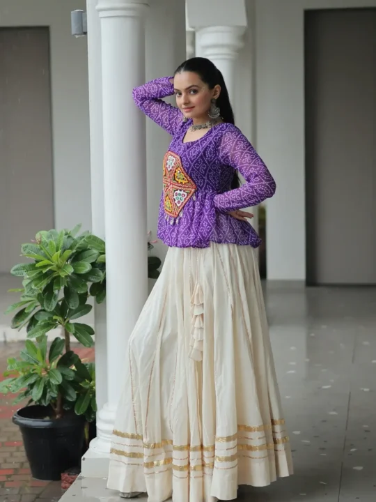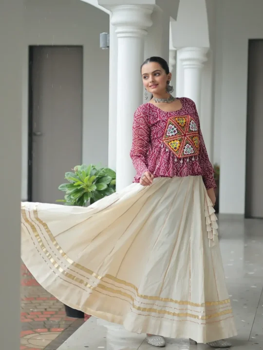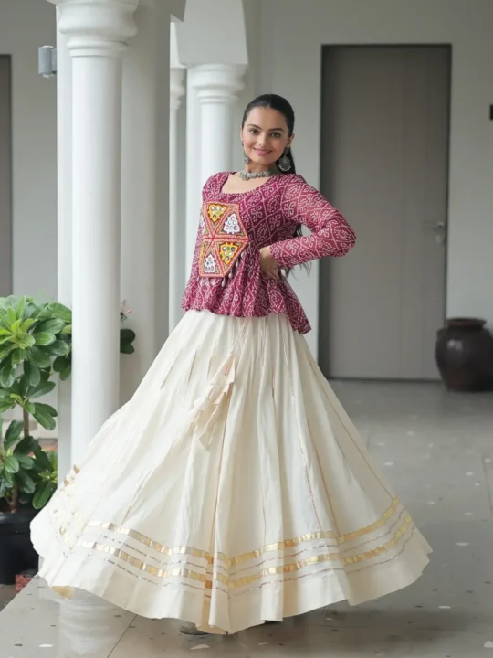 Gamthi work kora cotton lehenga featuring a Bandhani print top and Gota Patti lace, offering a ready-made chaniya choli perfect for festive elegance.