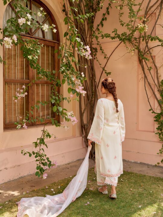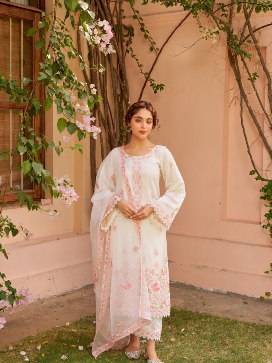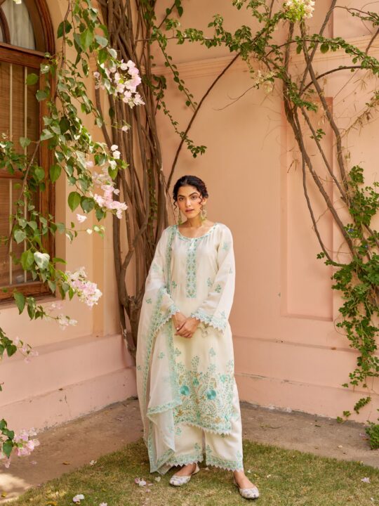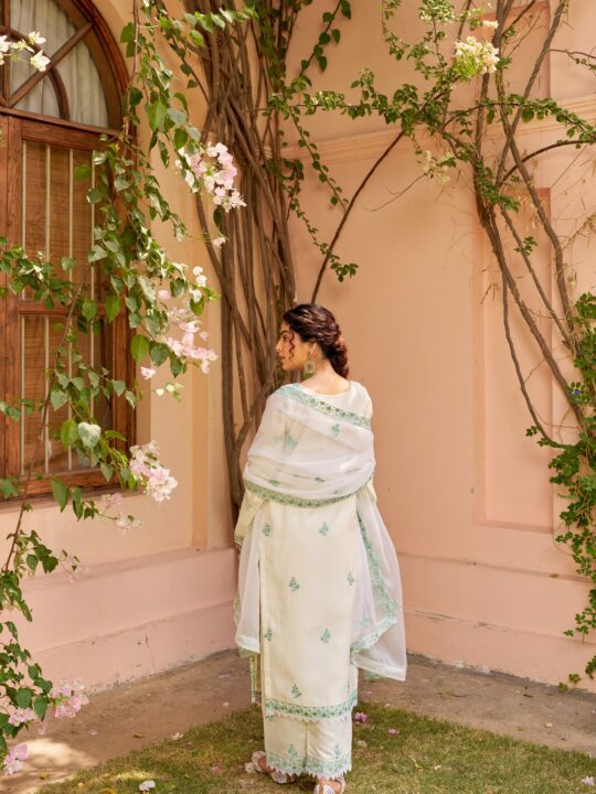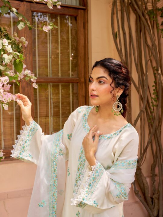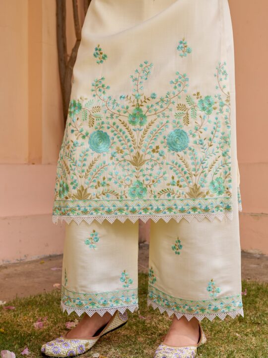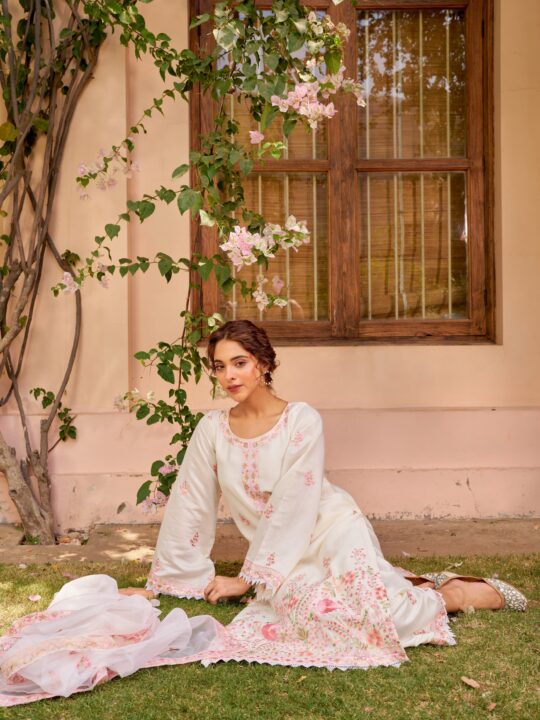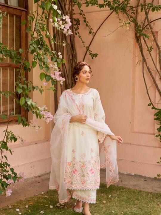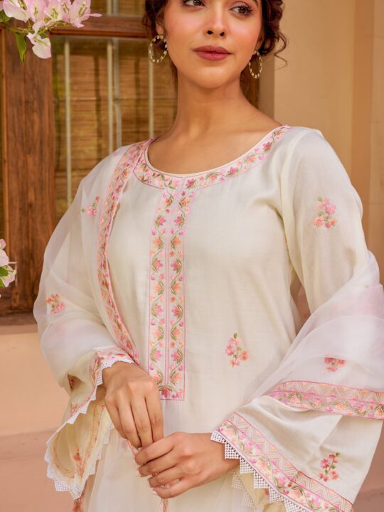 Ivory White Chanderi Embroidered Suit Set. Made from soft Chanderi silk, this ombre-style kurta is light, breathable, and beautifully detailed. Its multi-color thread work adds charm and grace to every thread.
