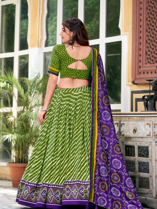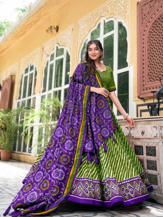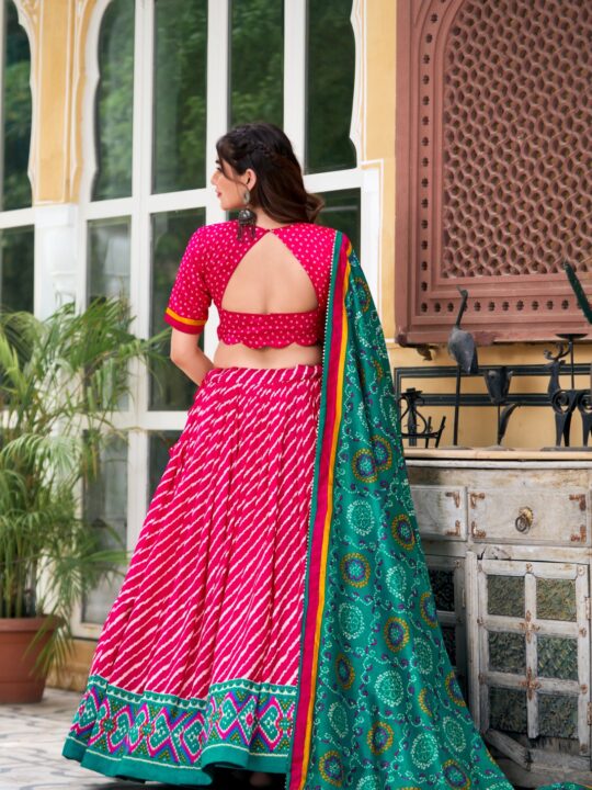 Leheriya tussar silk lehenga choli with Patola border and Bandhani dupatta—perfect for festive and wedding occasions. Shop now!