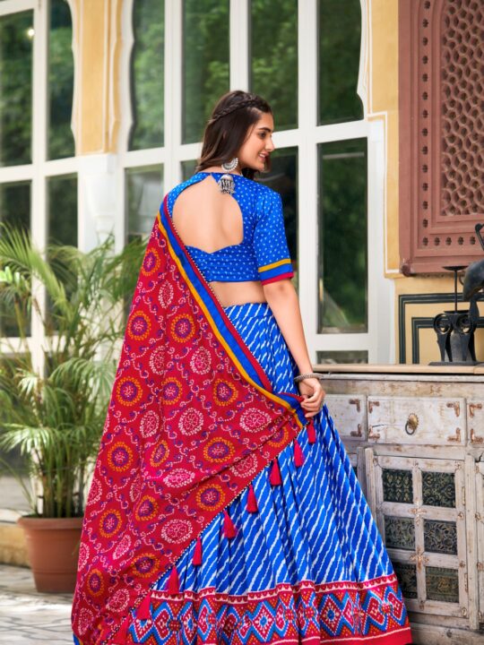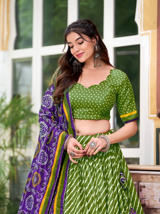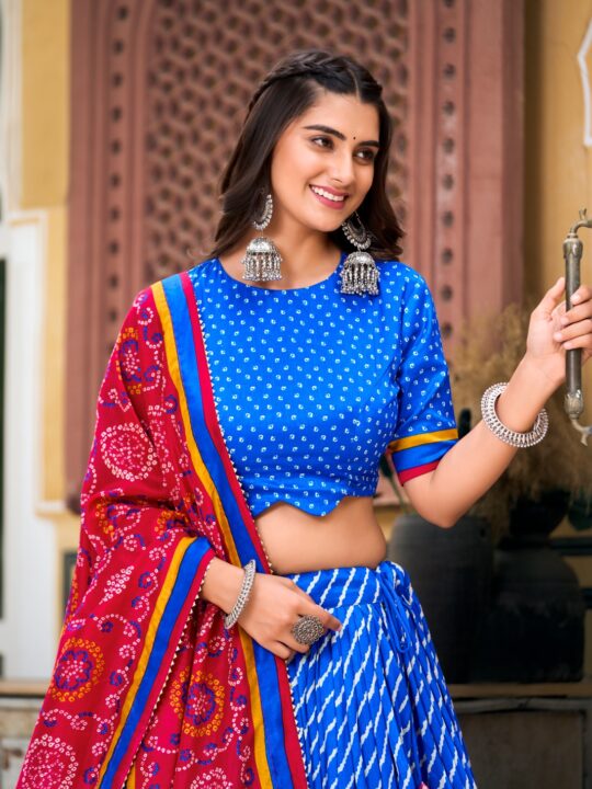 Pair this lehenga choli with oxidized silver jewelry or traditional gold for a striking festive look. You can wear it for Navratri nights, sangeet functions, or vibrant day weddings. Additionally, the blend of Leheriya and Bandhani prints makes it a unique choice for cultural events and religious ceremonies. For a modern twist, add a waist belt or statement clutch.