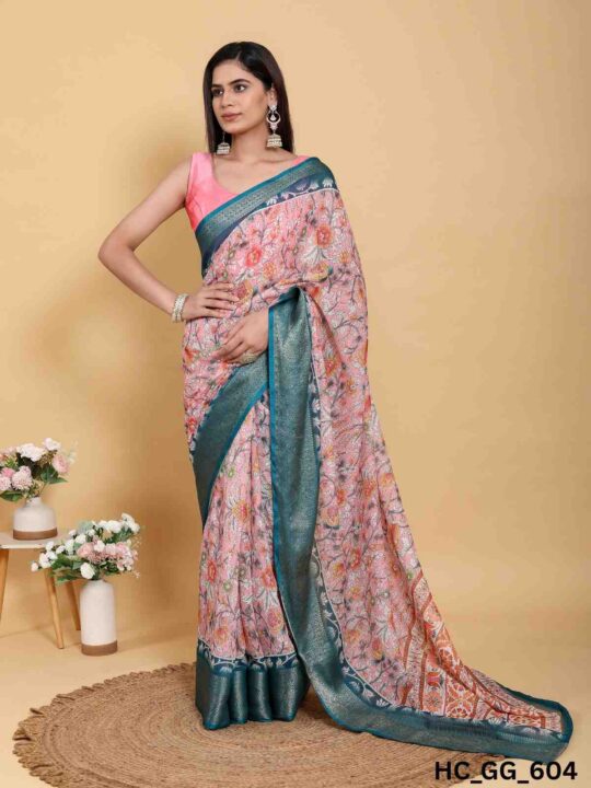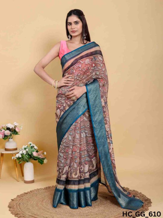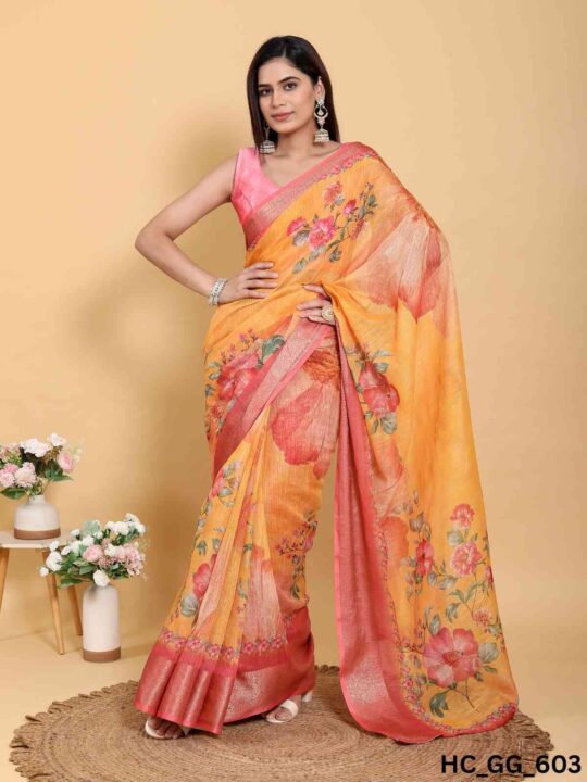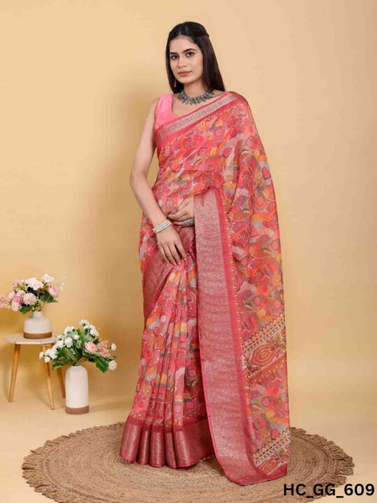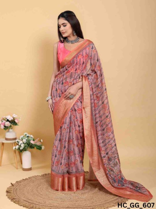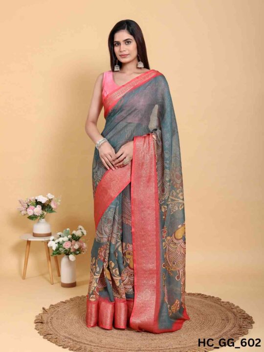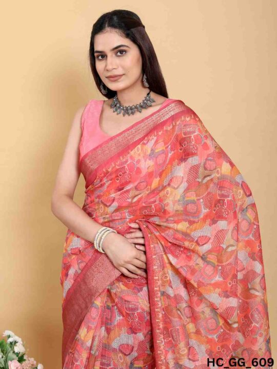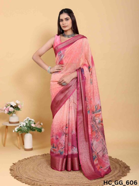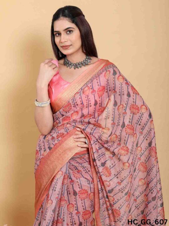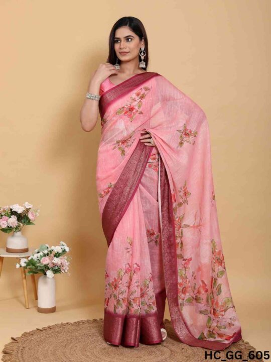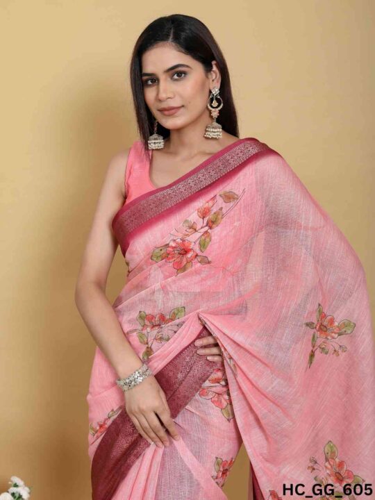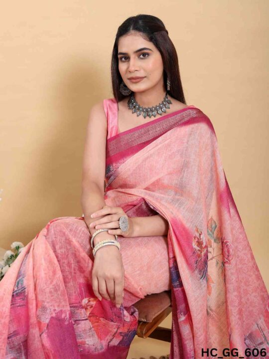 Linen cotton saree for women from Pramukhmart. Lightweight, breathable, with jacquard border & matching blouse piece – perfect for festive events.
