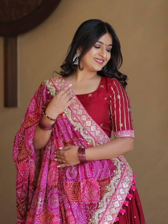 Pair this lehenga with statement earrings and colorful bangles for a complete festive look. It goes beautifully with both flats and traditional juttis. Whether you’re joining a temple event or dancing the night away, this outfit ensures comfort and style. Plus, the vibrant colors make your photos pop—perfect for Instagram!