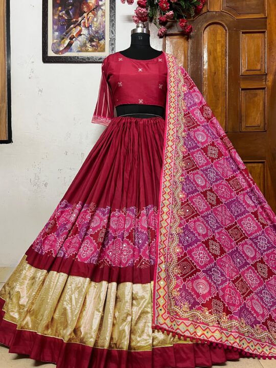 Navratri lehenga choli crafted for women who value comfort and culture features breathable fabric, joyful prints, and a graceful flow that brings vibrant energy to every Garba night, making it your perfect festive outfit.