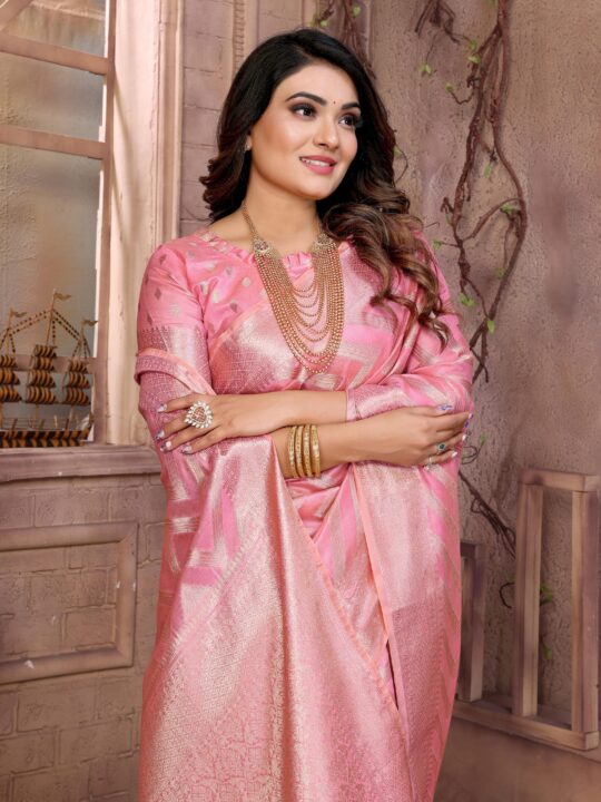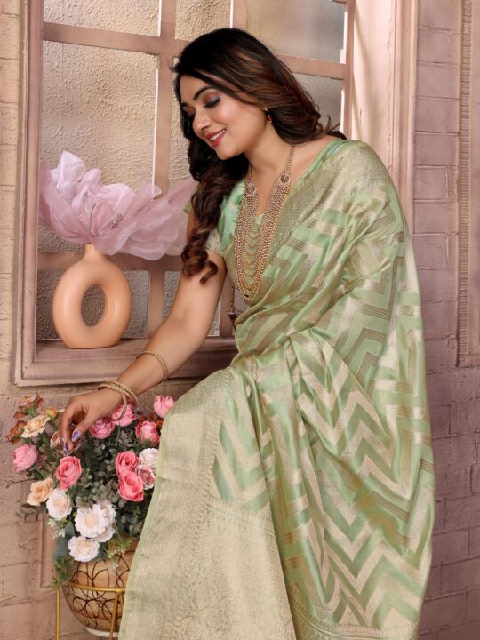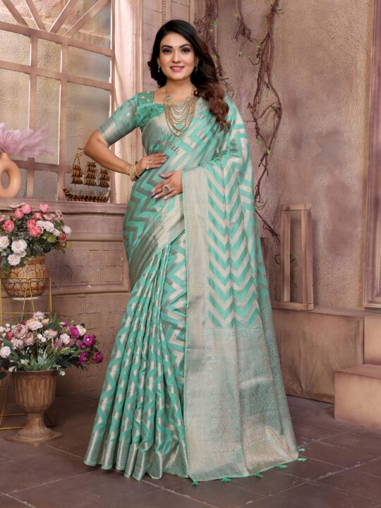Organza Silk Banarasi Saree from Pramukhmart. It’s an artistic treasure designed to make every moment special. Whether you’re dressing for a wedding or a festive evening, this saree blends tradition with sophistication.