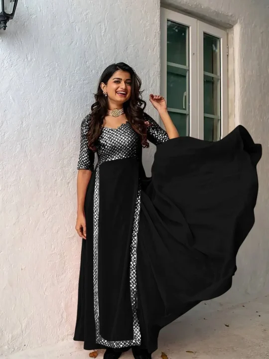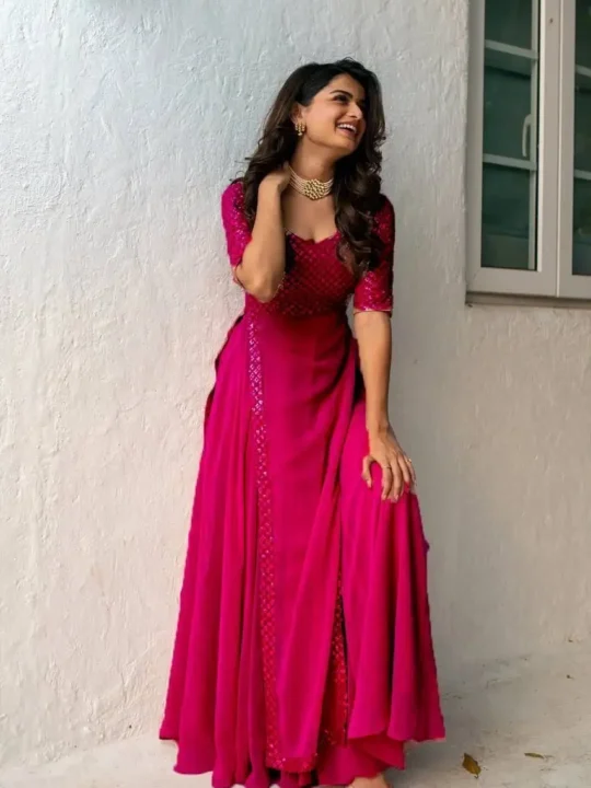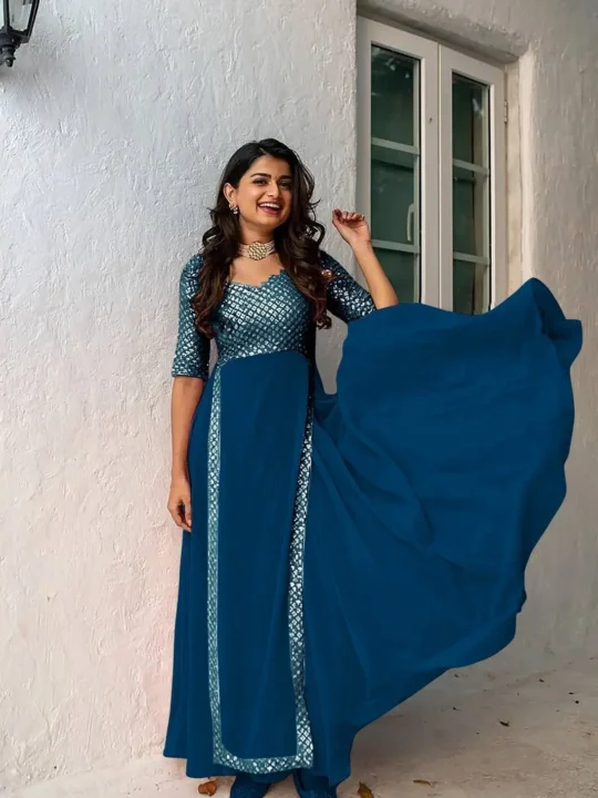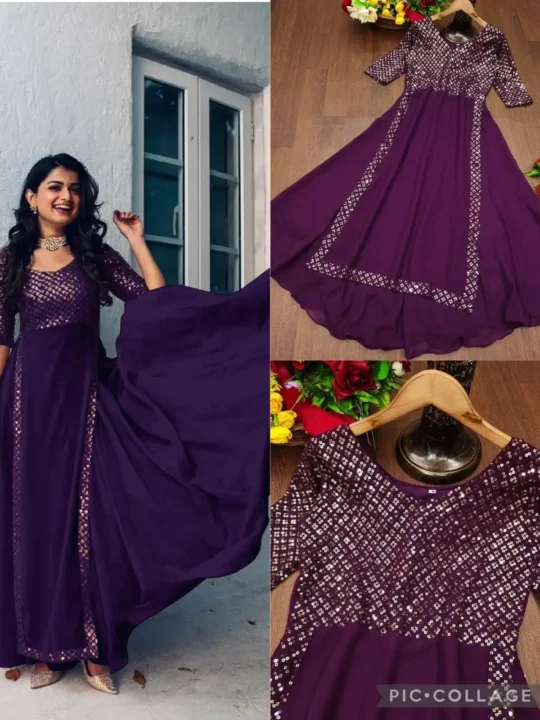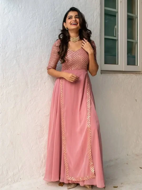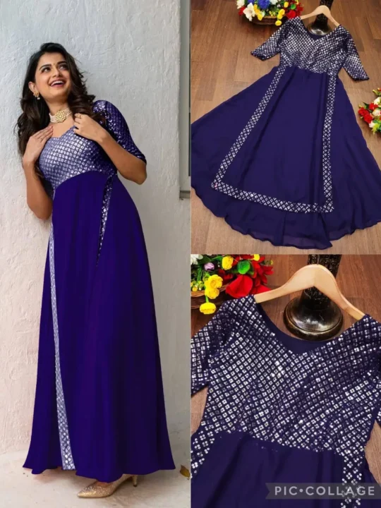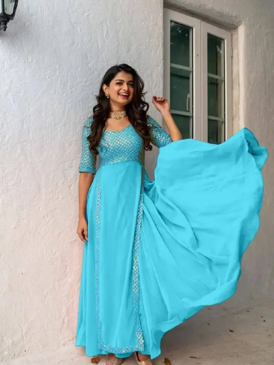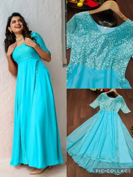 Get ready for your next event. Our stunning Party Wear Sequence Gown is a must-have. This beautiful piece from Pramukhmart will make you shine. It blends heavy georgette fabric with intricate handwork. The lightweight feel ensures you can dance all night long.
