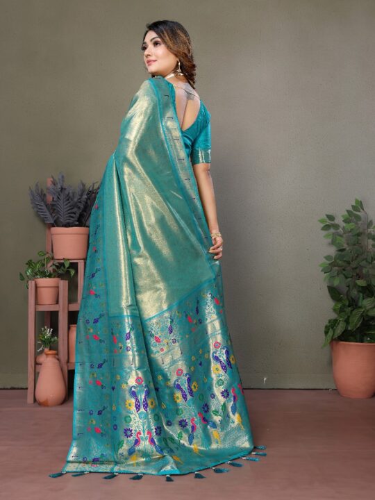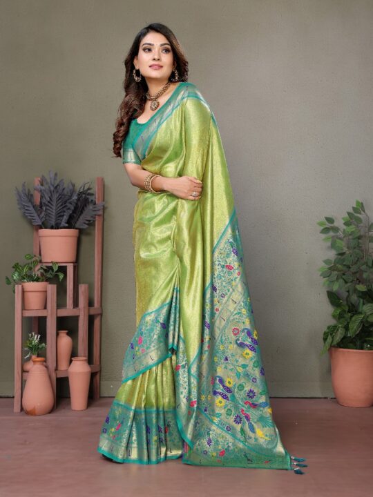 Pure tissue silk saree with rich Paithani border. Soft, flowy & elegant. Perfect for weddings & festivals at Pramukhmart.