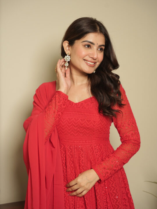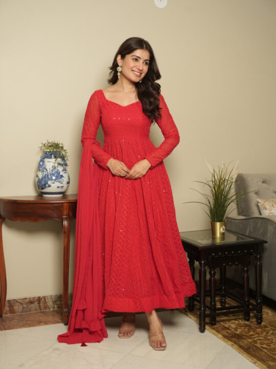 Red georgette Anarkali suit – elegant three-piece outfit with timeless Lucknowi detailing, designed for comfort, style, and effortless grace. Perfect for women seeking traditional yet contemporary festive wear.