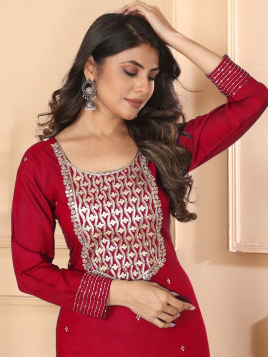 Pair it with statement earrings and strappy sandals for a wedding function. Or simply add flats and a tote for a more relaxed family get-together. Because of its premium embroidery, this suit works great for festivals, parties, and traditional days. In addition, the lace dupatta adds just the right amount of grace.