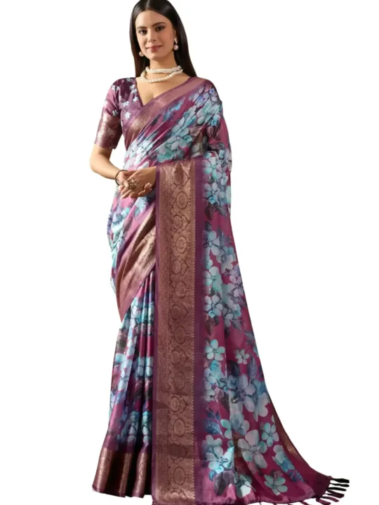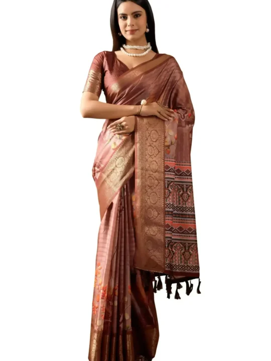 Soft Lichi Silk Saree with Patola Motifs by Pramukhmart. This saree blends luxurious finesse with traditional artistry and delivers a soft drape and subtle sheen that suits festive celebrations beautifully.