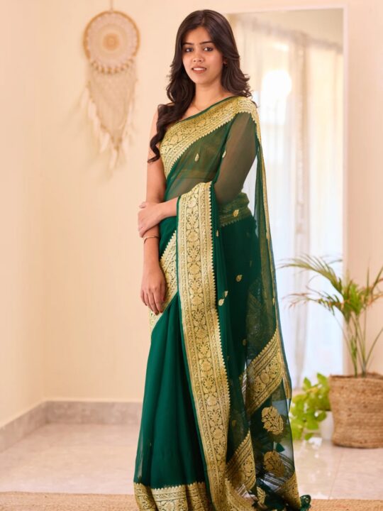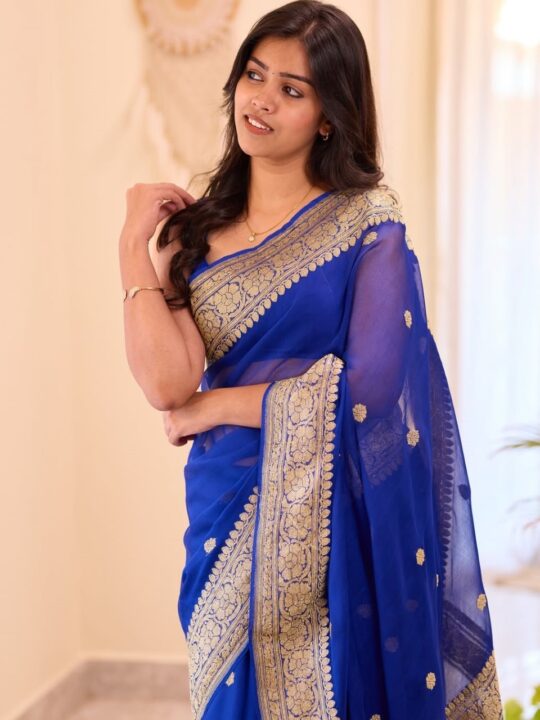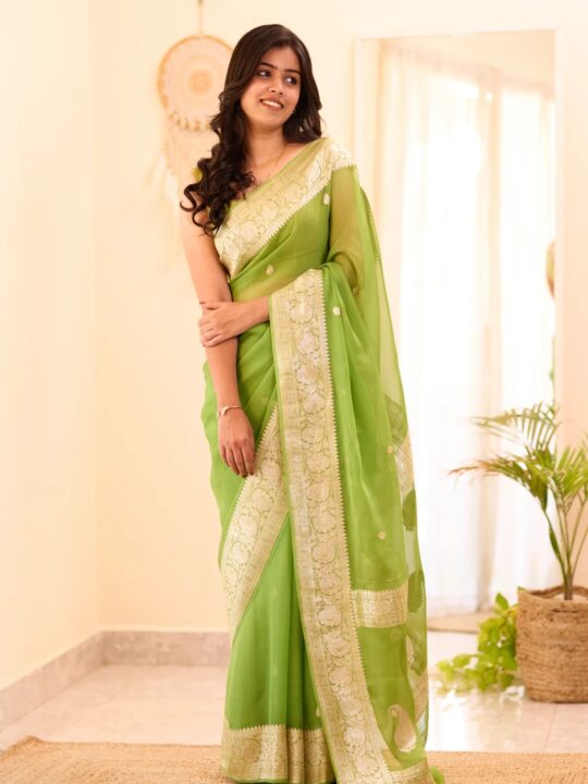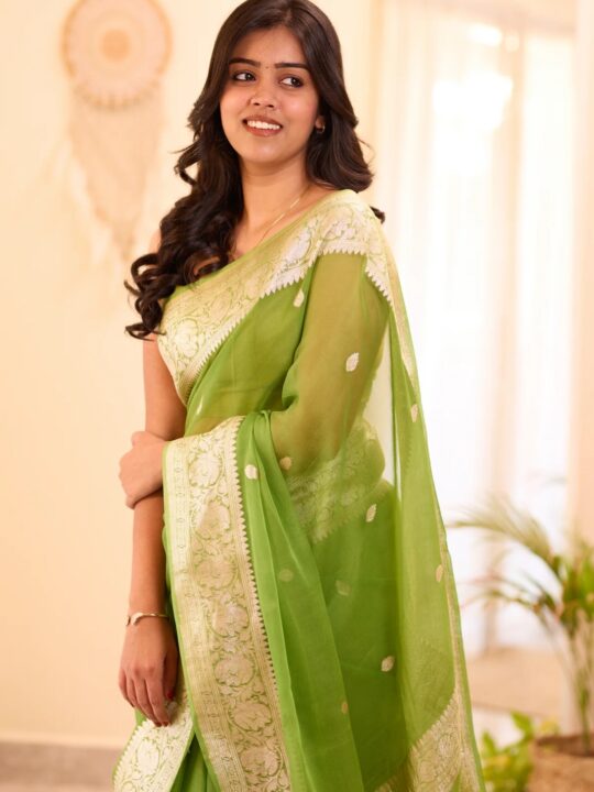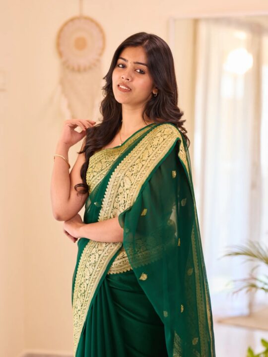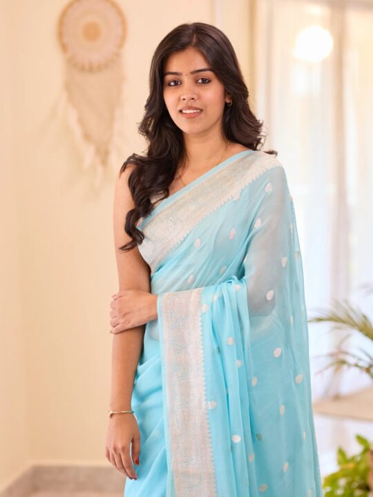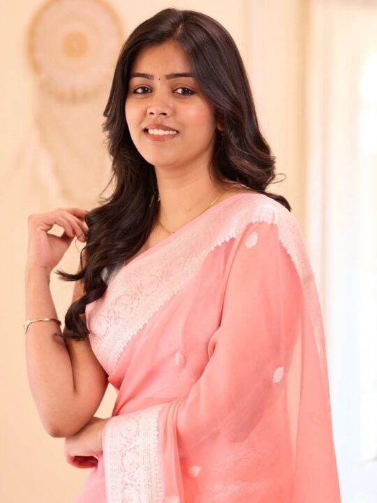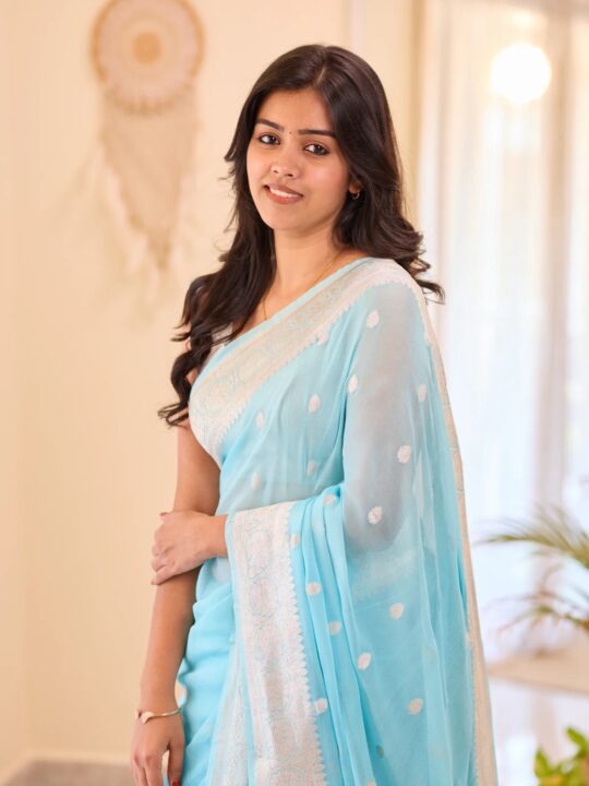 This saree pairs beautifully with jhumkas and minimal makeup for a classy day look. For events, add a statement necklace. Its soft texture keeps you comfy at work or at casual functions. Therefore, it’s perfect for both daily and festive wear.